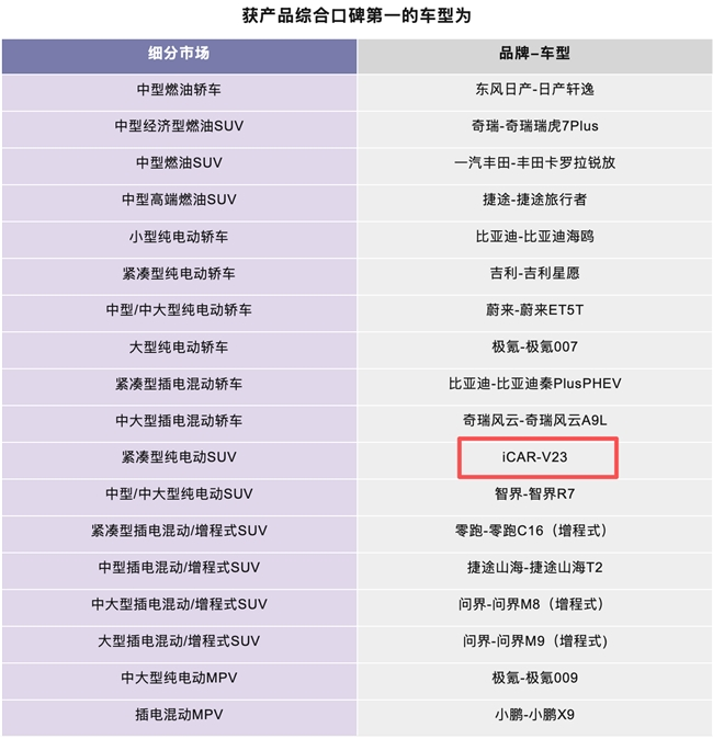 近日,国际汽车质量标准化协会(IAQSA)联合中国汽车推荐度研究工作组发布《2025中国汽车推荐度研究(NPS)报告》。报告基于覆盖全国75个城市、11831份有效样本的大规模调研,对132款主流车型进行系统评估。报告涵盖了品牌口碑、品质体验、价值感知、销售与服务体验五大维度的真实数据指标。其中,iCAR V23在紧凑型纯电SUV细分市场中一举斩获产品综合口碑第一,成为该报告中备受关注的新能源车型之一。